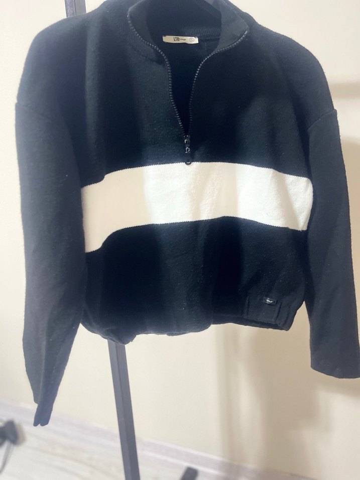 Yarım fermuarlı, uzun kollu ve yüksek yakalı bu kadın sweatshirtü, yumuşak ve sıcak kumaştan üretilmiştir. Göğüs kısmında beyaz geniş çizgi vardır.