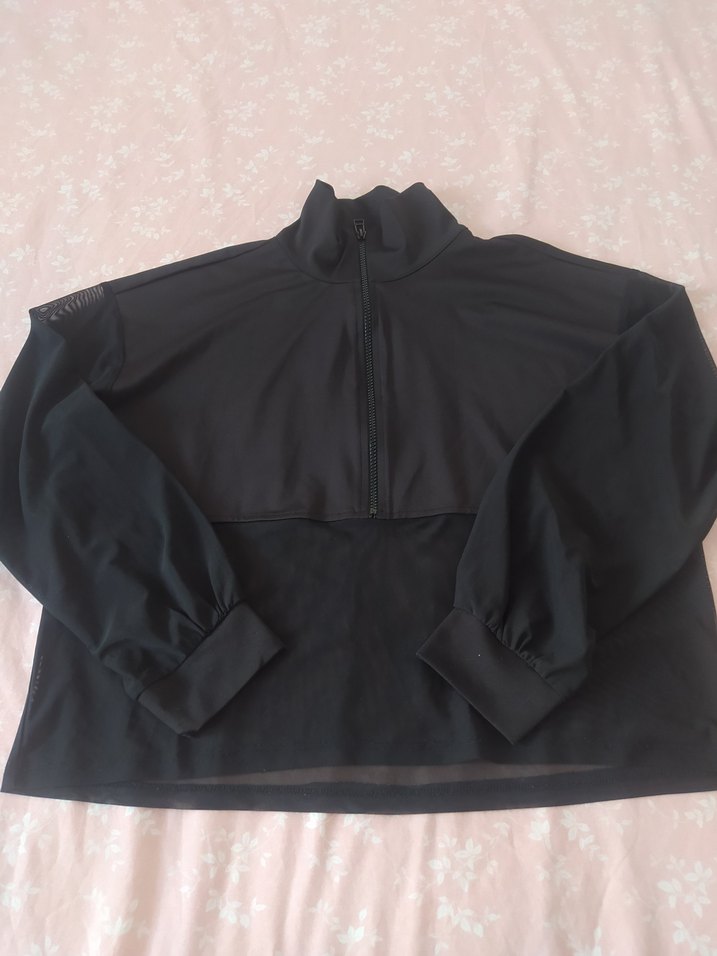 Yarım fermuarlı, yüksek yakalı, uzun kollu siyah kadın sweatshirt. Rahat kesimi ve yumuşak kumaşıyla günlük kullanım için uygundur.