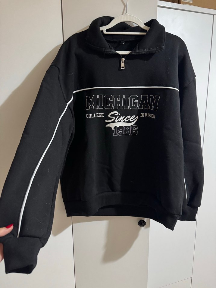 Uzun kollu, yüksek yakalı ve yarım fermuarlı siyah oversize sweatshirt. Michigan 1996 baskısı ve beyaz şerit detayları bulunur. Rahat günlük sokak stili.