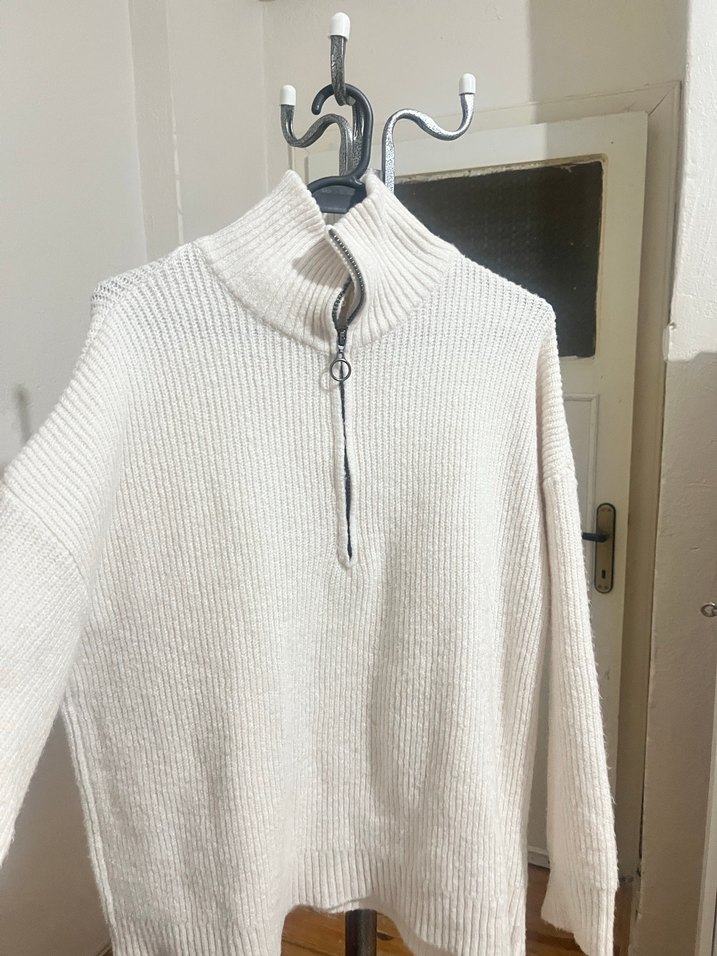 Yarım fermuarlı yüksek yakalı, uzun kollu beyaz triko kazak. Rahat kesimi ve sade deseniyle günlük sokak stili için ideal. Yumuşak triko kumaştan üretilmiştir.