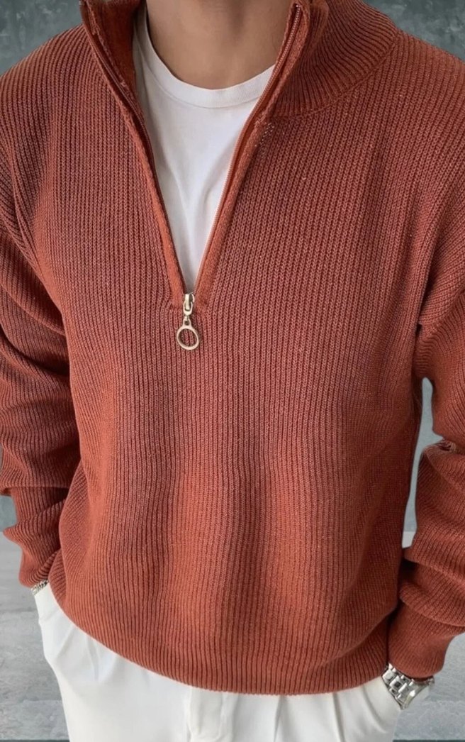 Yarım fermuarlı, yüksek yakalı, uzun kollu, düz kahverengi renkli erkek triko kazak. Rahat ve bol kesim, sokak stiline uygundur. bedenleri mevcuttur
