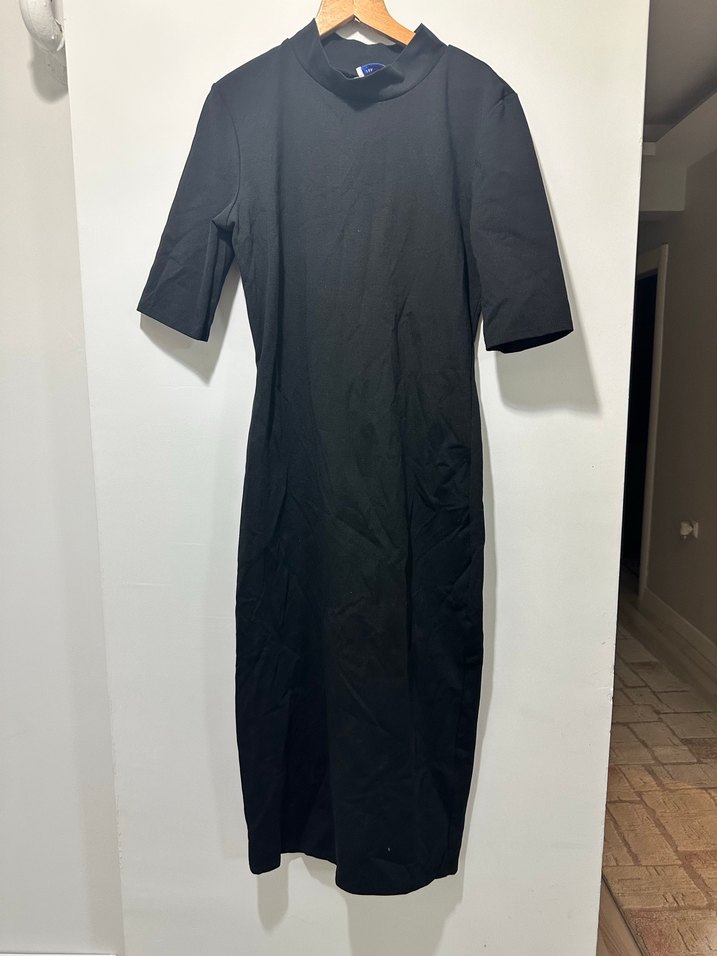 Yarım kollu, yüksek yakalı, siyah uzun elbise. Düz ve sentetik dokulu, minimal ve şık bir stil sunar. Ofis ve günlük kullanıma uygundur.