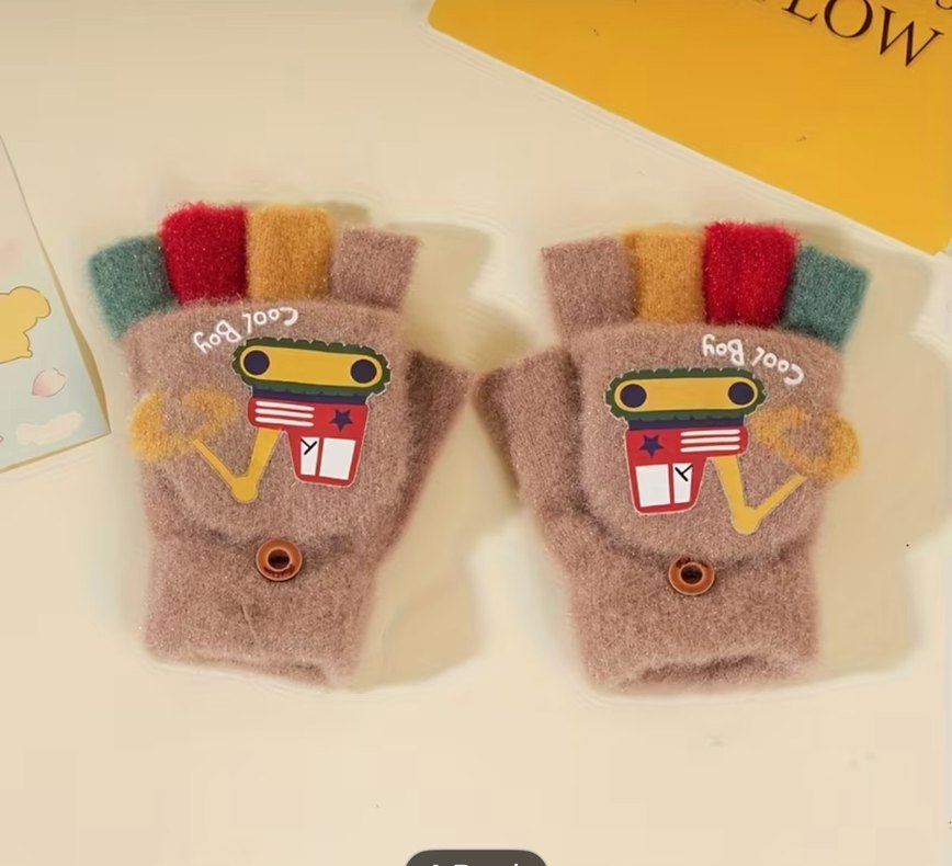Erkek çocukları için yumuşak dokulu, kahverengi taban renkli, renkli nakışlı ve düğme detaylı yarım parmak eldivenler.
