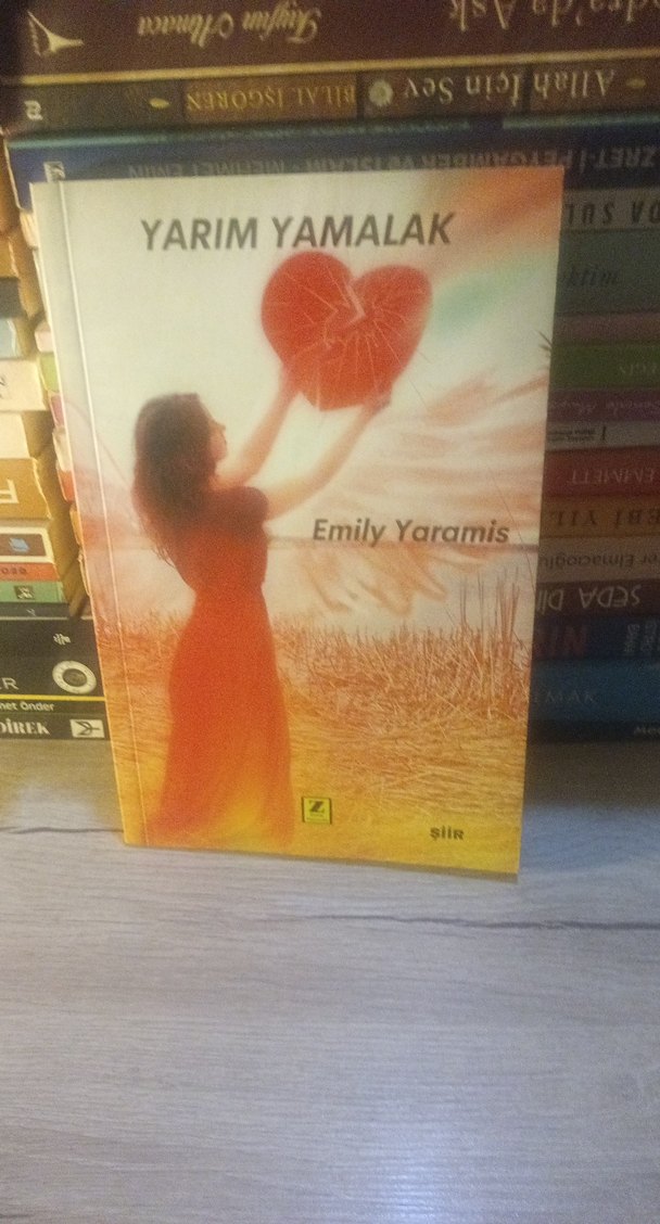 Emily Yaramis'in "Yarım Yamalak" adlı şiir kitabı, kırık bir kalbi tutan bir kadını gösteren kapağıyla duygusal temalar işliyor.