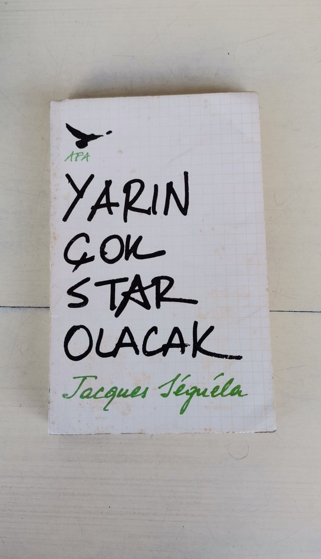 Jacques Séguéla'nın 'Yarın Çok Star Olacak' adlı romanı, beyaz kapak üzerine el yazısı tarzında siyah ve yeşil metinlerle basılmış. APA yayınevinin basımıdır.