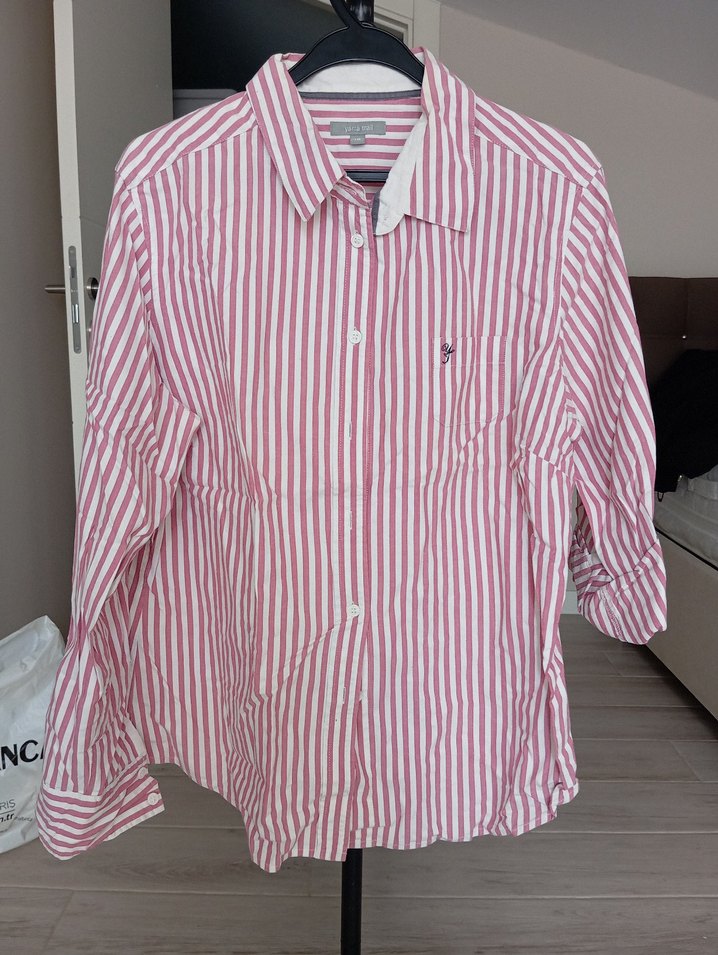 Bordo çizgili pamuklu kumaştan, uzun kollu, yakalı ve düğmeli kadın gömleği. Normal boy ve rahat kesim, günlük sokak stiline uygundur. Koltuk altı ölçüsü 55 Boy 63 cm dir.