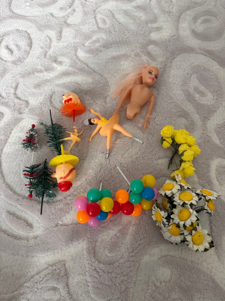 Yaş pasta suslerı Çiçekler, balonlar ve küçük ağaçlar gibi çeşitli aksesuarlarla renkli mini bebekler.