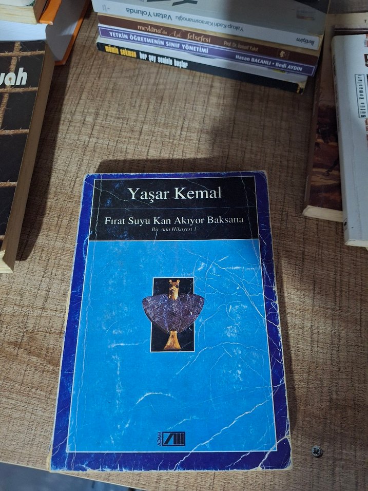 Yaşar Kemal'in 'Fırat Suyu Kan Akıyor Baksana' adlı romanı, ortasında simgesel bir görsel bulunan yıpranmış mavi kapaklıdır.