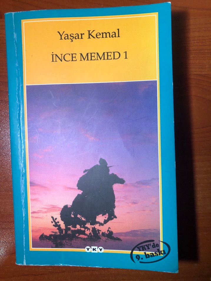 Yaşar Kemal'in İnce Memed 1 romanı, gün batımı gökyüzü önünde bir atlı siluetiyle dikkat çekiyor. 9. baskı, YKY tarafından yayımlandı.