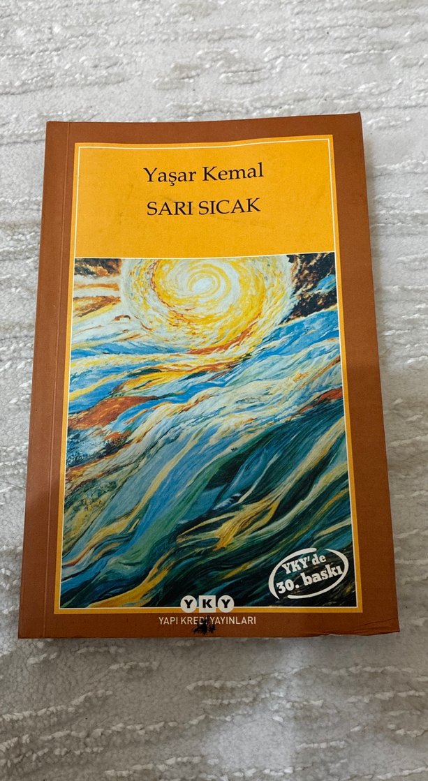 Yaşar Kemal'in 'Sarı Sıcak' romanı, Yapı Kredi Yayınları tarafından 30. baskı olarak yayımlanmıştır. Türk edebiyatının önemli eserlerinden biridir. Yangın dolayısıyla is almış. Okumaya engel bir durum yok.