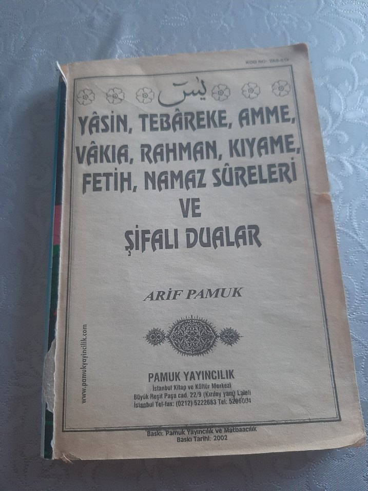 Bu Türkçe kitap, Yasin, Tebareke, Amme, Vakia, Rahman, Kıyamet, Fetih, namaz sureleri ve şifalı duaları içerir. kitabın sadece ön kapagı yok onun dışında hiç bir sıkıntısı yok