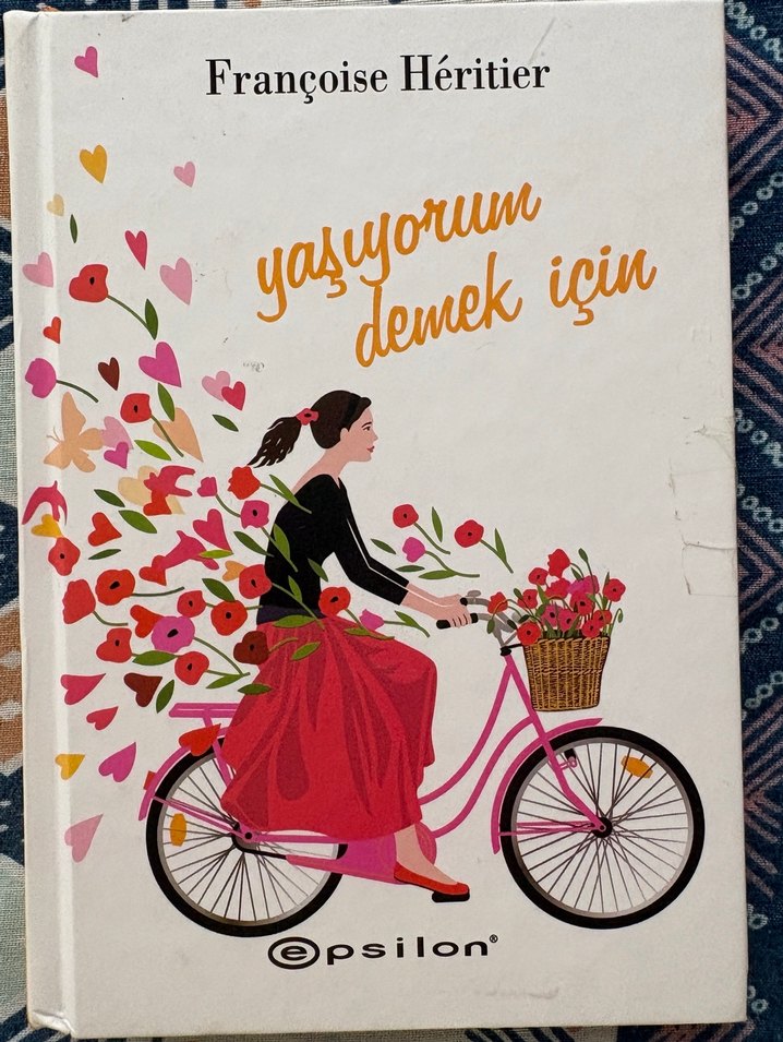 Francoise Héritier'in 'Yaşıyorum Demek İçin' adlı romanı, çiçeklerle dolu bisiklet süren bir kadını gösteren kapak tasarımına sahip. Epsilon yayınevi.