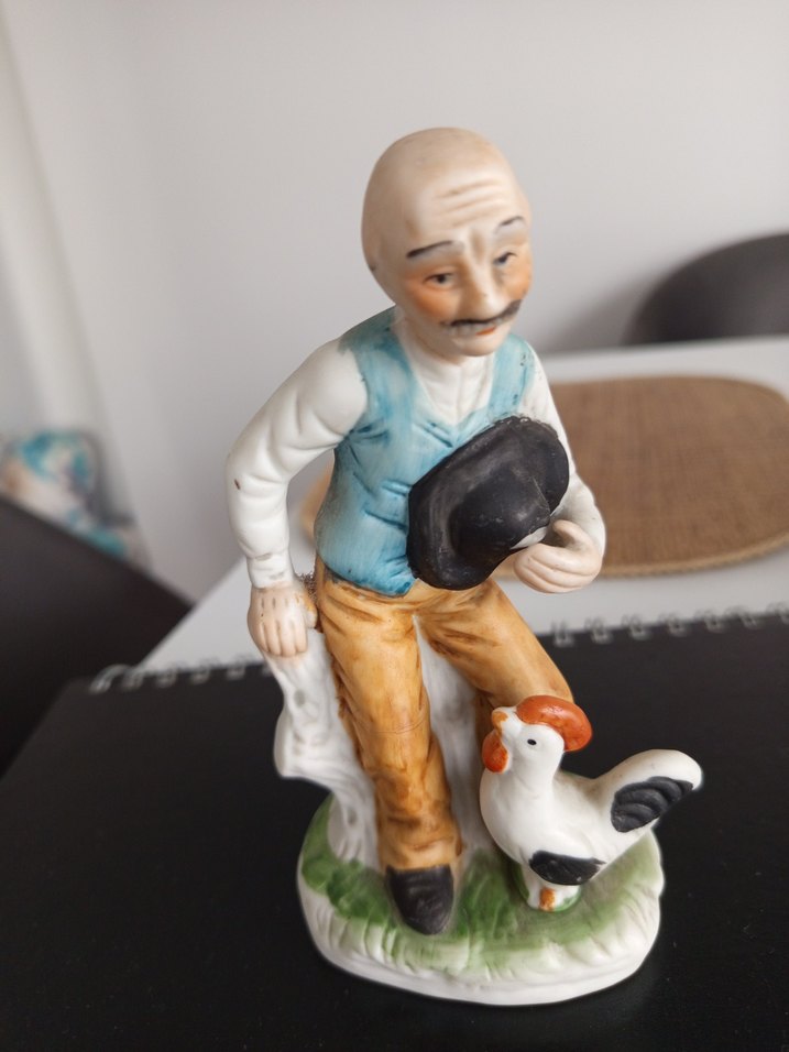 Yaşlı adamın siyah şapka tuttuğu, yanında horoz bulunan ve yeşil taban üzerinde duran figürin. Adam açık mavi yelek ve kahverengi pantolon giymekte. 15 cm dir.boy.