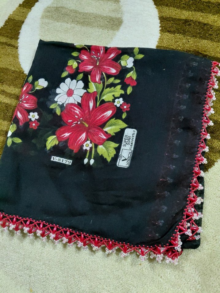 Kırmızı ve beyaz çiçek desenli, dantel detaylı siyah kadın fular. Vintage tarzda, klasik tasarıma sahip. 85 85 yeni yaşmaklık tülbent
