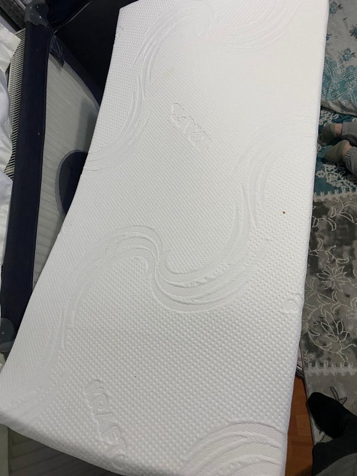 Beyaz ve gri renklerde, hafif dalga desenli yumuşak dokulu yatak park yatagın üst kısmı için almıştım bir kaç ay kullanıldı temizdir