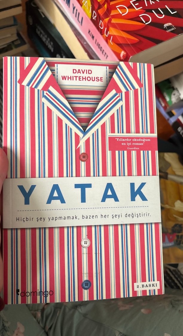 David Whitehouse'un "Yatak" kitabı, çizgili gömlek tasarımıyla kapak süslenmiş. "Hiçbir şey yapmamak, bazen her şeyi değiştirir" sloganı yer alıyor. 2. baskı, Guardian'ın övgüsüyle.