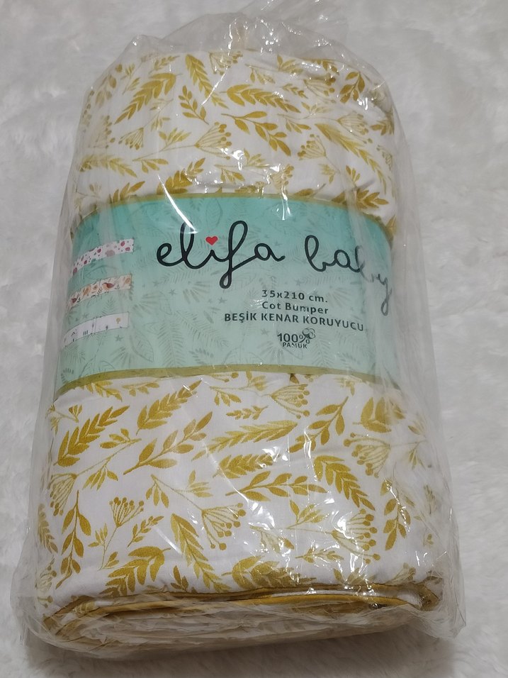 Pastel sarı renkli, yaprak desenli yatak kenar koruyucusu . 35x210 cm ölçülerinde, beşik kenar koruyucu olarak kullanılabilir.