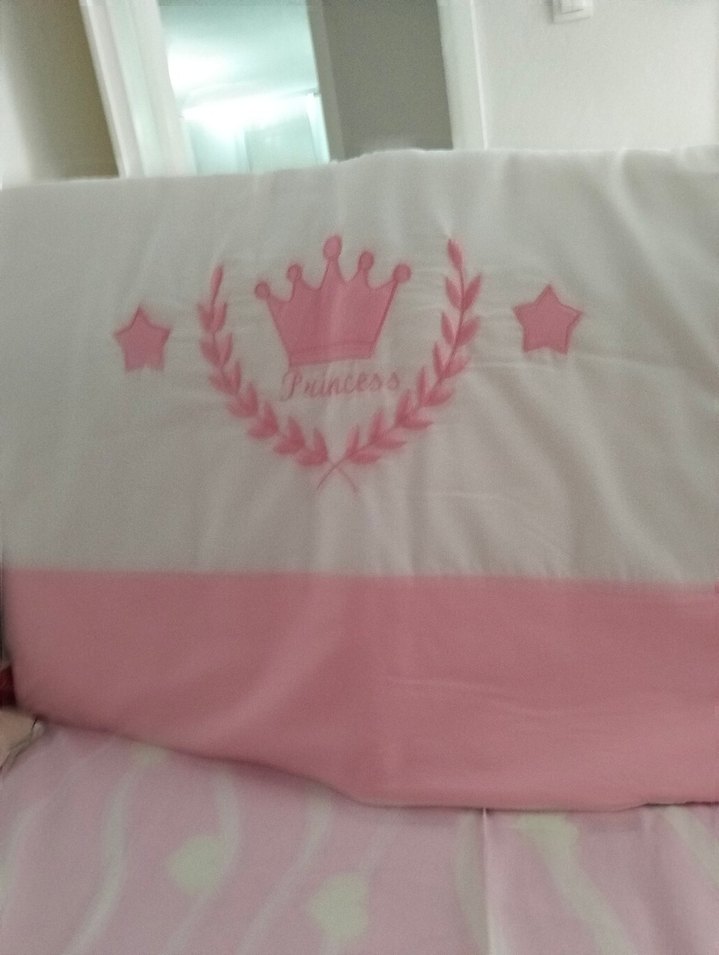 Yumuşak ve sıcak kumaştan yapılmış, baskılı taç ve yıldız desenli pastel pembe çocuk uyku yastığı. Üzerinde 'Princes' yazısı bulunur. Beşik kenarı için fermuarlı yıkanabılır kısa süre kullandım tertemiz yıkandı ilk günkü gibidir...