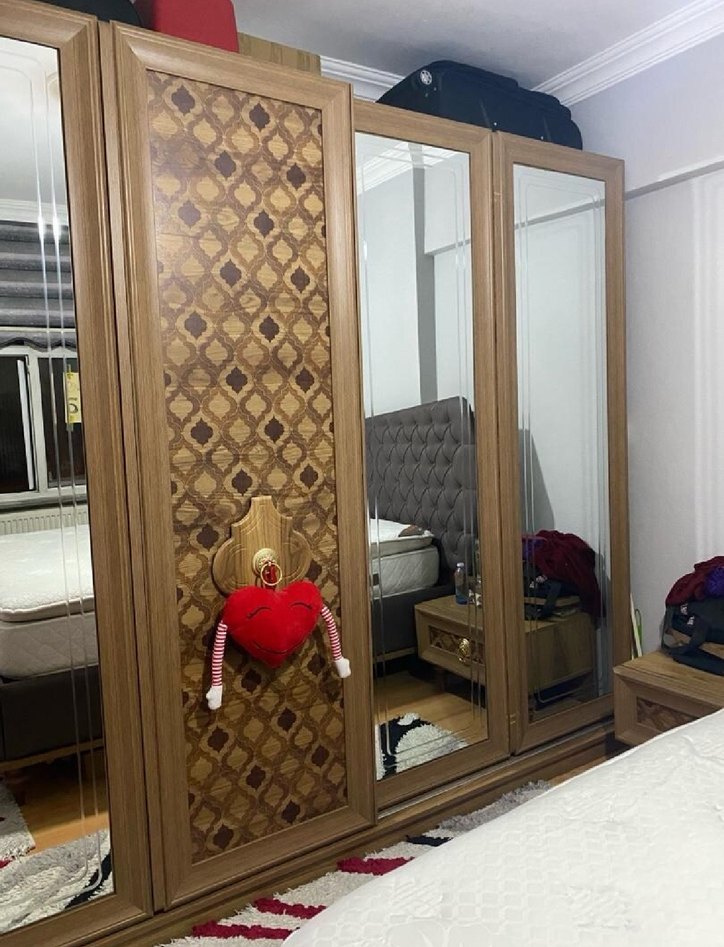 bazalı yatak ve başlığı, 4 kapılı 3 aynalı, ahşap sürgülü büyük gardrop, 2 komidin, 1 makyaj dolabı masası büyük, ve aynası