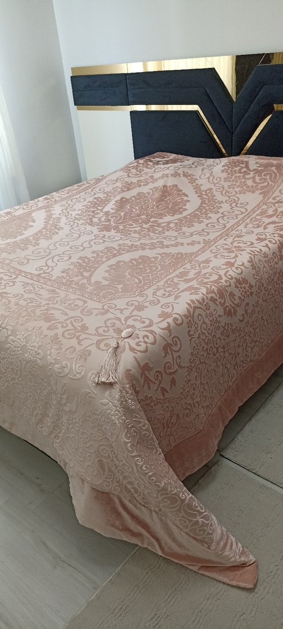 Pastel pembe renkte, detaylı nakış işlemeli ve yumuşak dokulu yatak örtüsü. Şık görünüm için püskül detayları bulunur. ️ 2-3 kez anca kullandım tertemiz Özdilek marka