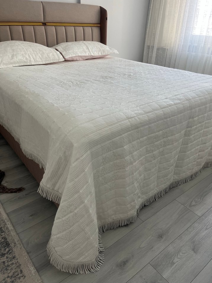 Beyaz renkte, nakışlı desenlere ve püsküllü kenarlara sahip yumuşak dokulu yatak örtüsü. Hiç bir sorunu yoktur 2 3 defa kullanıldı 2 adet yastık kılıfı ve yatak örtüsüyle göndericem