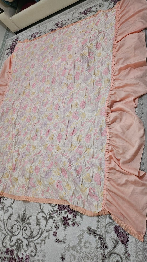 Pastel pembe renkte, nakış işlemeli ve fırfırlı kenarlı yatak örtüsüdür. Yatağınıza yumuşak ve dekoratif bir dokunuş sağlar.