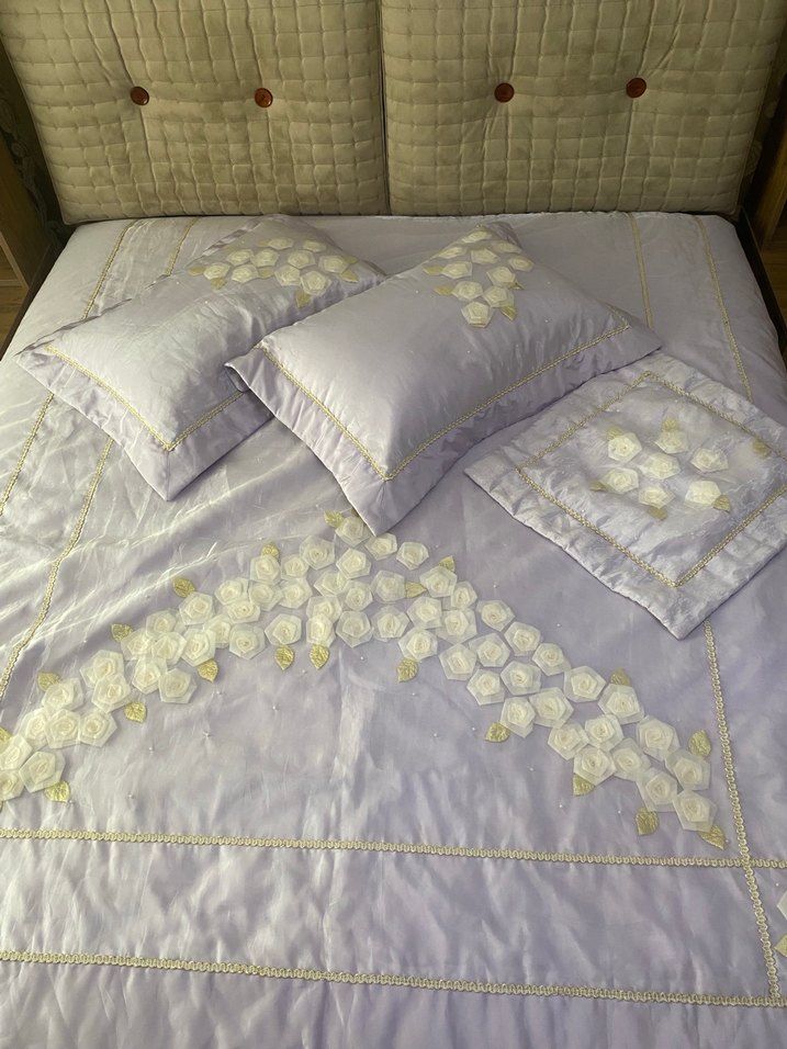 #Yatak örtüsü #Lila renk saten üzerinde Organizer tül var arasında çiçekler çok güzel detaylı yatak örtüsü