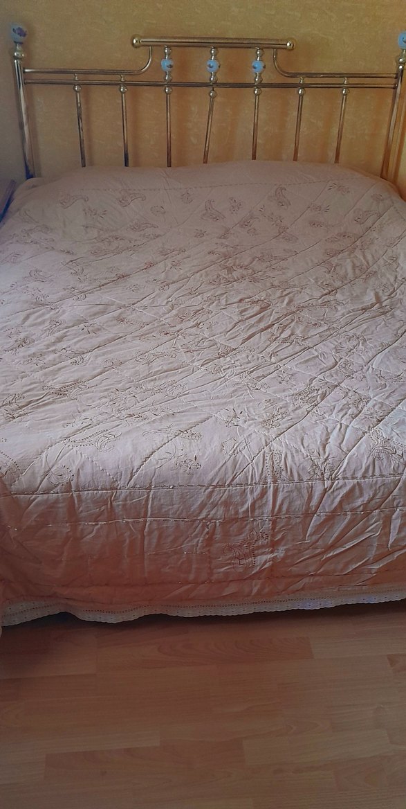 Bej renkte, işlemeli yumuşak dokulu çift kişilik yatak örtüsü, yatak odasına sakin bir hava katar. ️Yatak Örtüsü ve iki yastık.