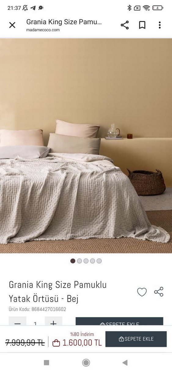 Grania King Size pamuklu yatak örtüsü, bej ekoseli desene sahip, yumuşak dokulu ve konforlu bir üründür. ️
