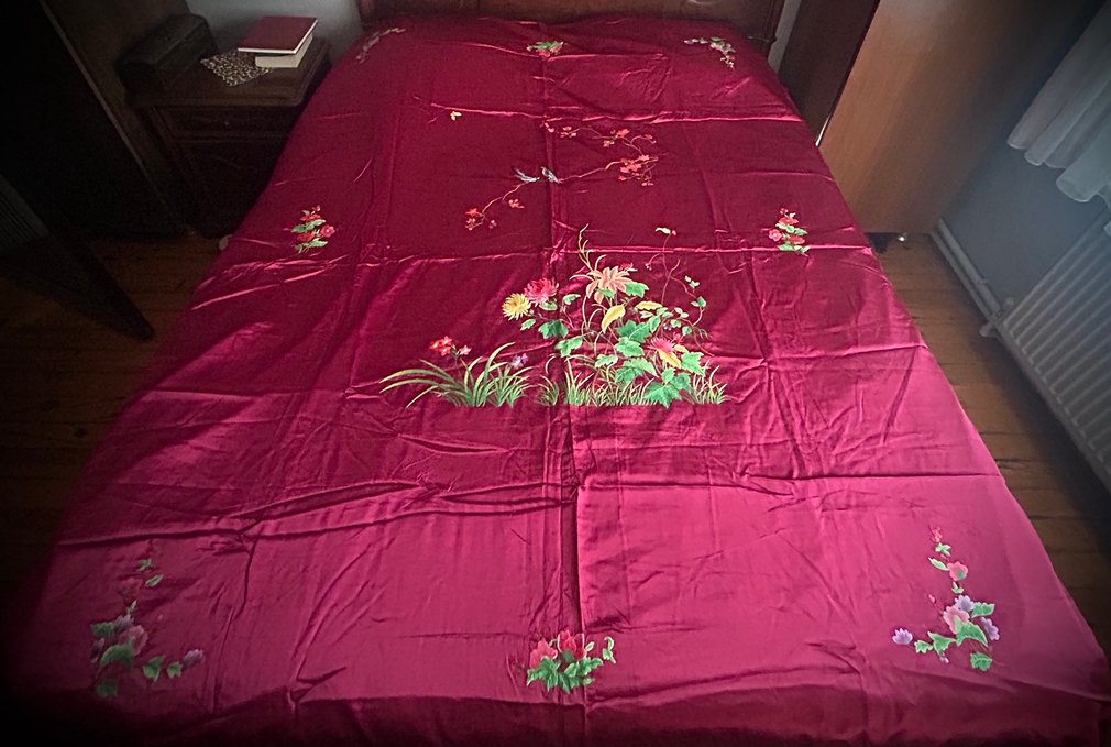 Ürün hiç kullanılmadı Vietnam’dan alındı.Çok kaliteli tok ipek saten üzerine el işi işlemedir.Altı da üstü de aynı saten kumaştandır.2 tane kırlenti var. Örtünün üstünde ki işlemeler ,üstte ki saten ve altında keten kumaş kullanılarak ikisi birlikte işlenmiştir.(Kırlentin içine ait fotoğrafta görülmektedir).Örtü ve kırlentlerin 4 kenarı püsküllüdür. Örtü ölçüsü 215*175 cm , kırlent ölçüsü 52*42 cm dir.