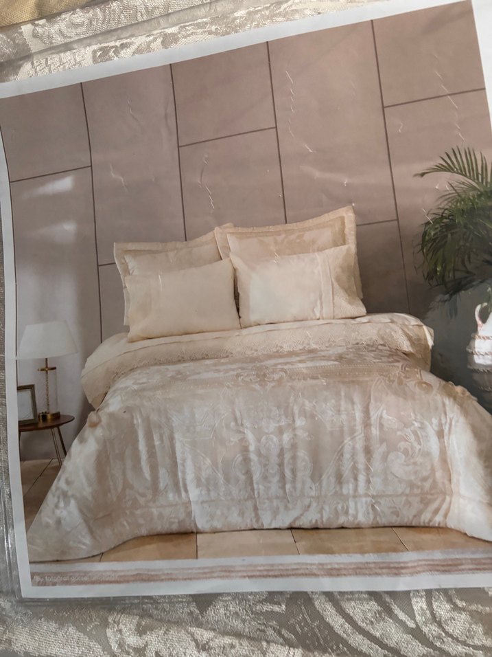 Krem desenli ve pürüzsüz yüzeye sahip yatak örtüsü. Her yatak odasına şık ve temiz bir görünüm katar.