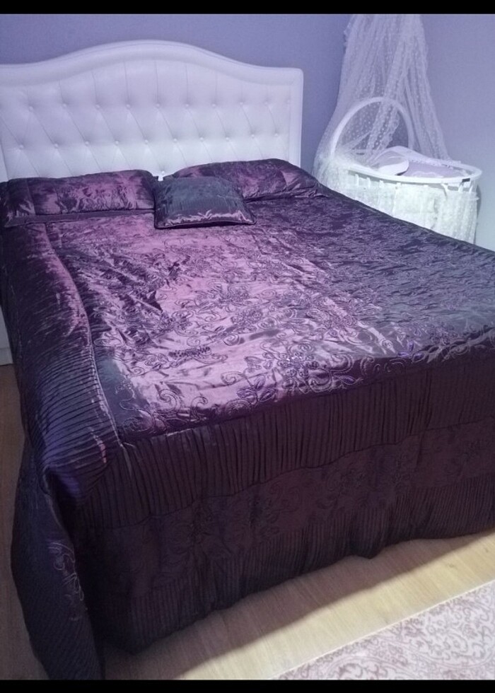 Sağlam. 3 yastıklı .az kullanılmış.özel poşetinde saklanmaktadır. Mor renkte nakış işlemeli