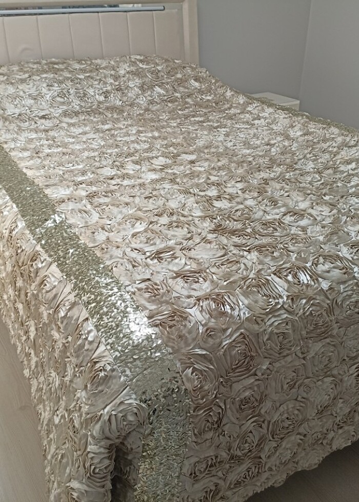 Saten çok şık yatak örtüsü çeyizlik.hic kullanılmadı iki adet yastık yüzü mevcut.