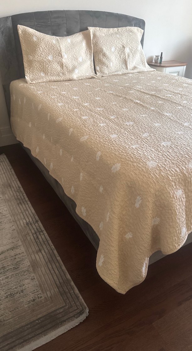 Hiç kullanılmadı etiketi yok çift kişilik yatak içindir .İki tarafı ayrı renk arkalı önlü kullanılıyor .iki yastık kılıfı da var .