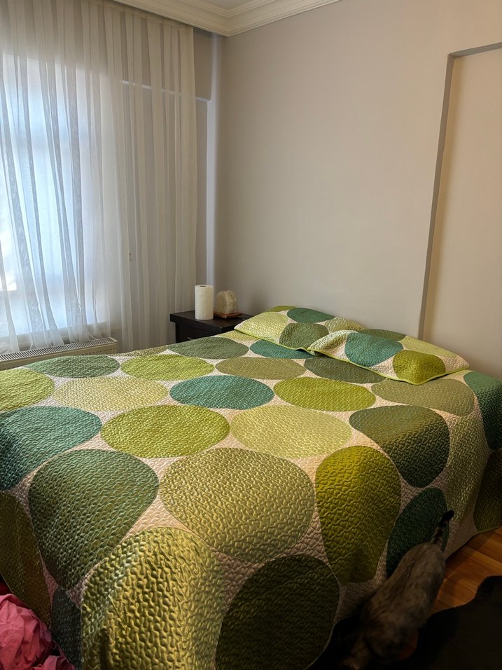 Yatak odasına ferah ve neşeli bir dokunuş katan açık yeşil büyük puantiyeli yatak örtüsü. Kumaşı hafif dokulu görünümde. ️