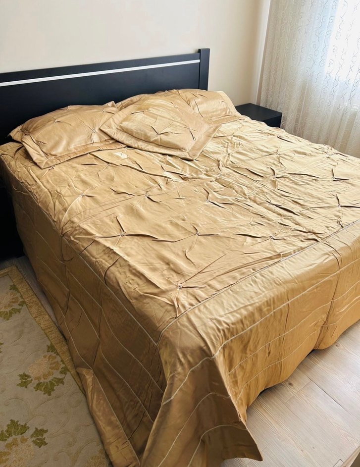 Battal Boy Yatak Örtüsü, Bal Köpüğü Rengi Taftadan Özel Dikimdir, 180*200cm yatak ölçüsüne göre dikilmiştir, 60cm Yatak Üstünden Sonra Sarkan Kısım Resimdede Görüldüğü Gibi Yere Kadar Uzanmaktadır, Yatak Örtüsü, 2 Adet Dikdörtgen ve 1 Adet Kare Süs Yastık Kılıfı Vardır, Sade ama Ağır Bir Modeldir, Sayılı Örtülmüştür. Marka Temsilidir!!!
