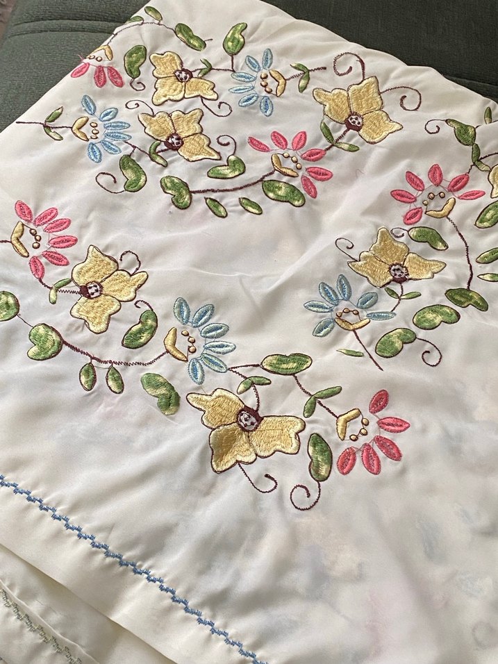 Kare sayilir …196 x 206 cm …birkac yerde siyah toz gibi lekesi var…ilk kez yikadim ama cikmadi …ortadan dikisli bir urun … keserek pek cok ortu cikarabilirsiniz …Nakışlı çiçek desenleriyle süslenmiş, pastel tonlardageleneksel