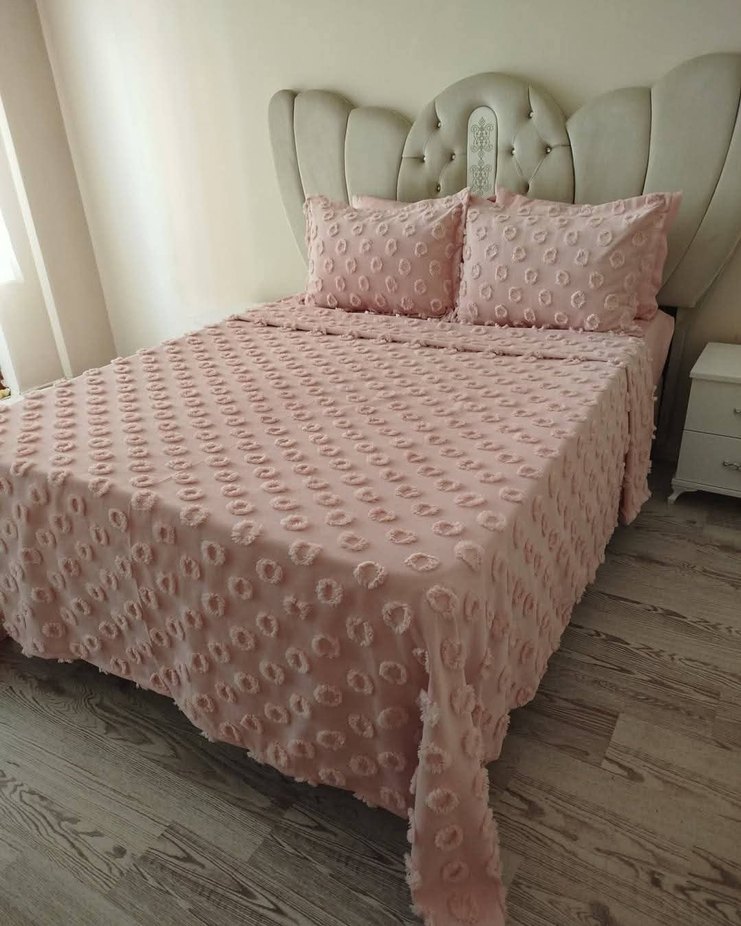 Yumuşak yatak örtüsü, pastel tonlarda puantiyeli dokusu ve uyumlu yastık kılıflarıyla yatak odasına rahatlık katar. ️ Cift kisilik 3 parça yatak örtüsü 240×260cm 1500 tl lTek kisilik 2 parça yatak örtüsü 180×250cm 1250 tl lütfen ilanı almadan önce renk ve model belirtiniz