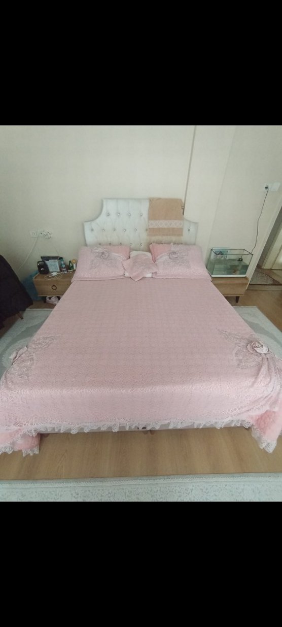 Pastel pembe yatak örtüsü, zarif nakış detayları ve yumuşak dokusuyla yatak odanıza şıklık katıyor.