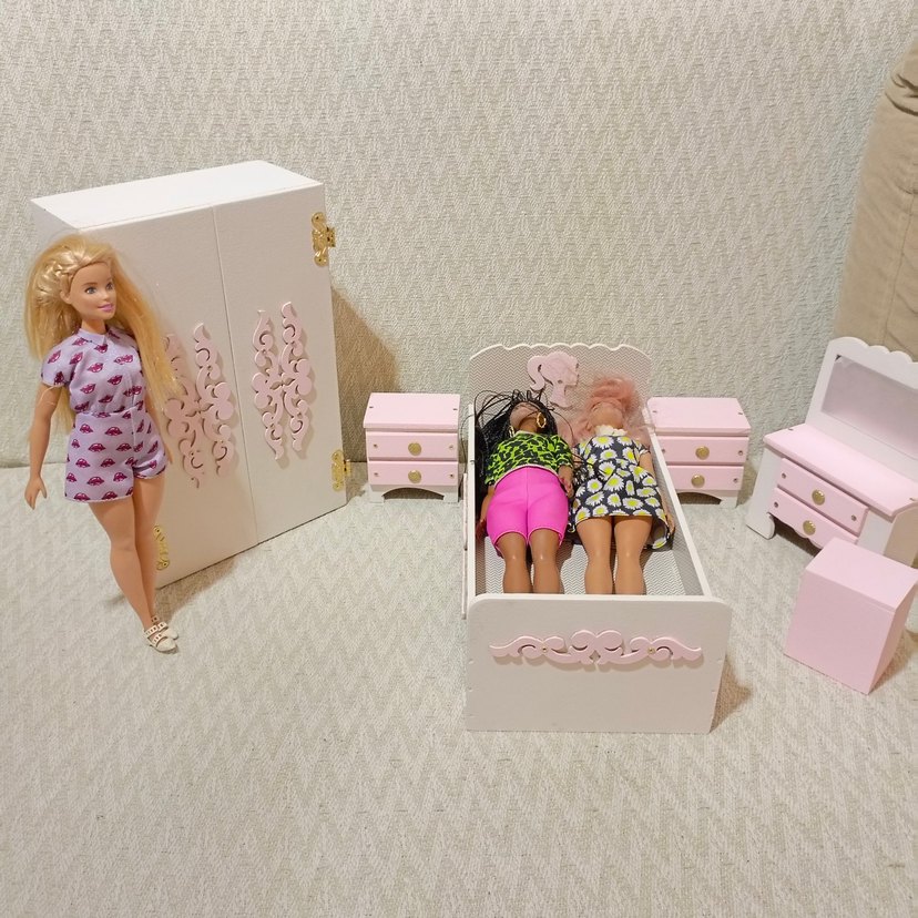 Pastel pembe renkte, bebekler için küçük yatak ve uyumlu komodinlerden oluşan çocuk yatak seti. Mobilyalarda süslü detaylar bulunur. ️