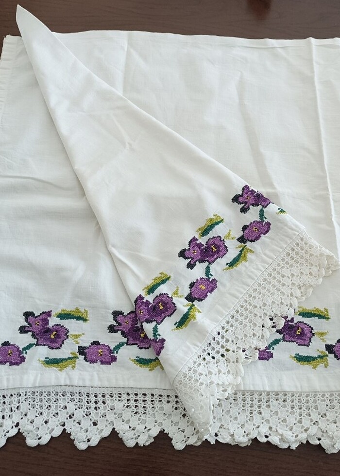 Kanaviçe ve dantelli yatak yan etek örtüsü. Boy 1.85 cm, en 50 cm. Çeyiz sandığından çıkmıştır. Çok kullanılmamıştır. Çok iyi durumdadır.