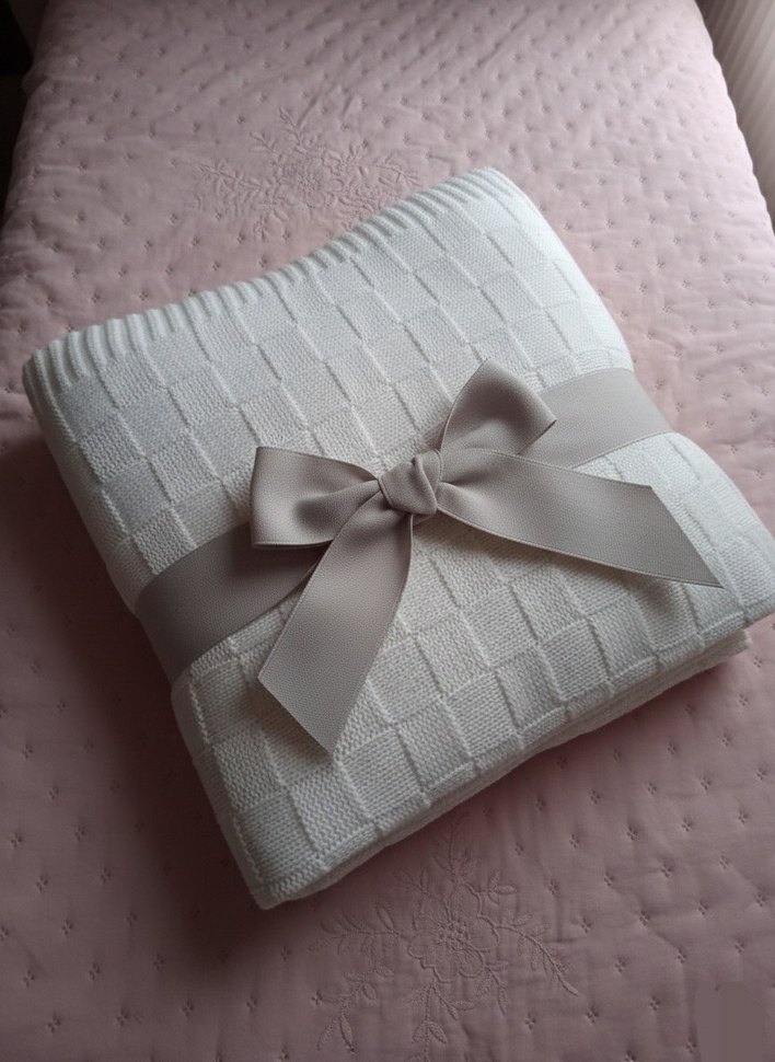 Beyaz örgü çocuk battaniyesi, hafif kare desenli, gri kurdele ile bağlanmış. Yumuşak ve konforlu kumaş. kurdele ile gönderilmeyecektir