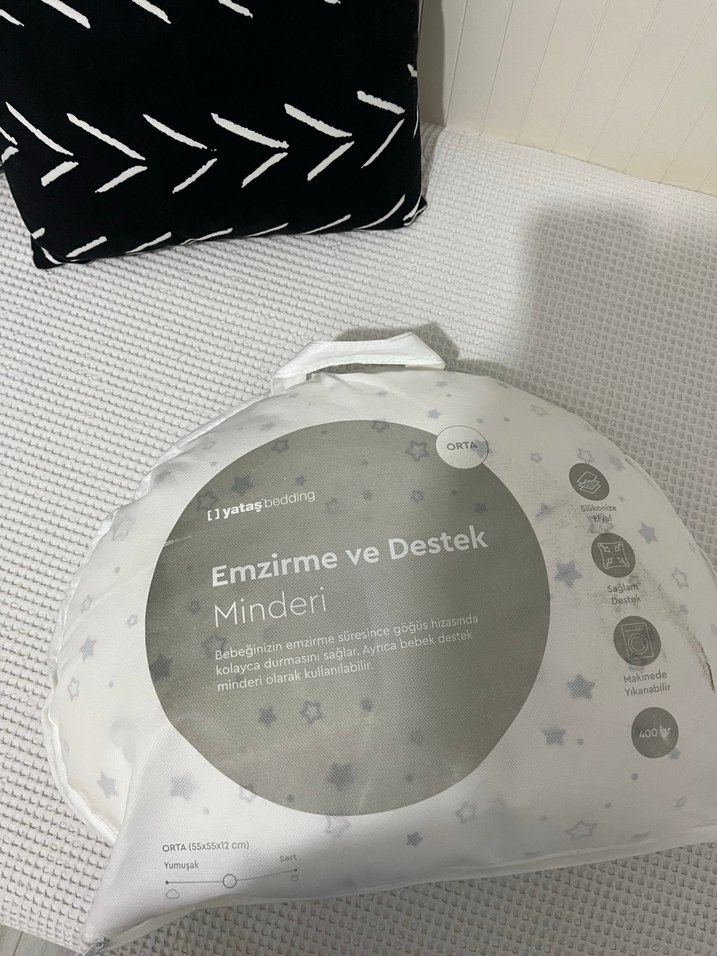 Bebek emzirme ve destek için gri, desenli minder. Orta boy, yumuşak kumaştan, rahat kullanım sağlar. Sağlık sorunlarımdan dolayı emzirmediğim için hiç kullanmadım. Yanında alt açma ve göğüs pedide göndereceğim göğüs pedi sadece doğum çantama birkaç tane koymak için içinden aldım diğerleri duruyor