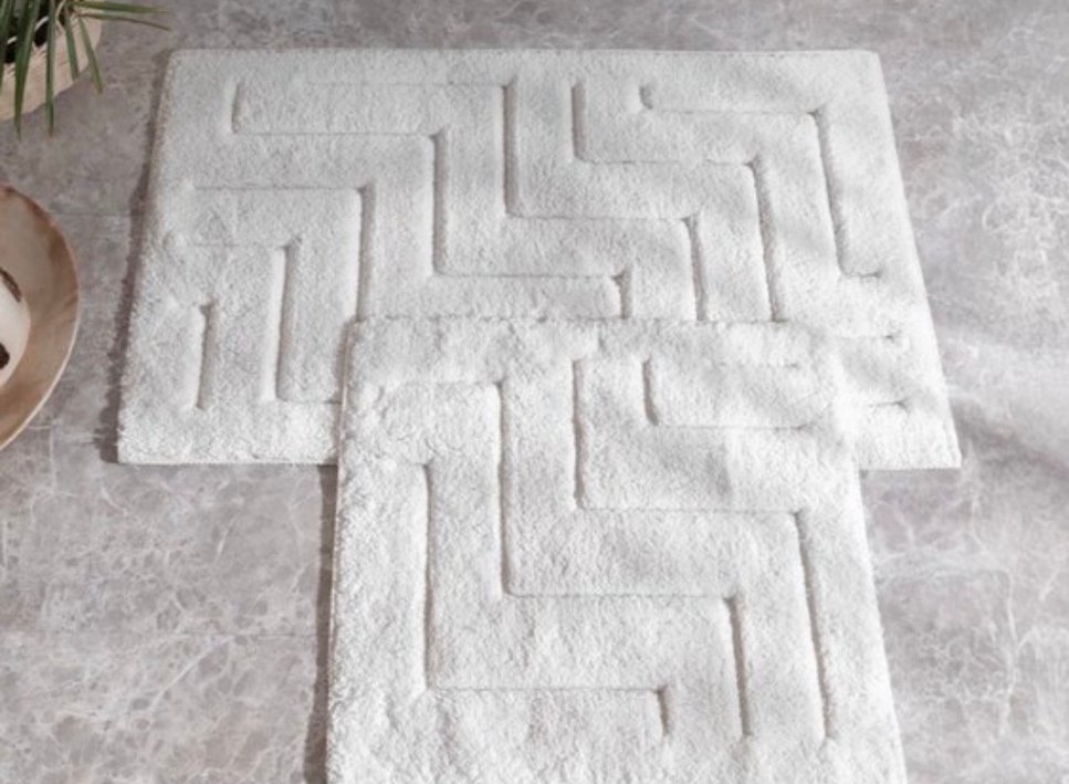 Beyaz renkte, kabartmalı geometrik desenli, yumuşak ve emici banyo paspası. Yataş etiketli paketli üründür kullanılmadı