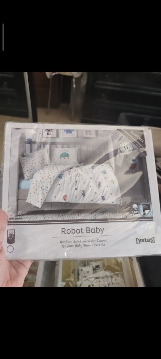 Yataş Robot Baby bebek nevresim takımı, hafif beyaz plastik malzemeden üretilmiş ve baskılı robot desenlerine sahip, bebek odasına neşeli bir dokunuş katıyor. mağazada 3000 tl dir efendim
