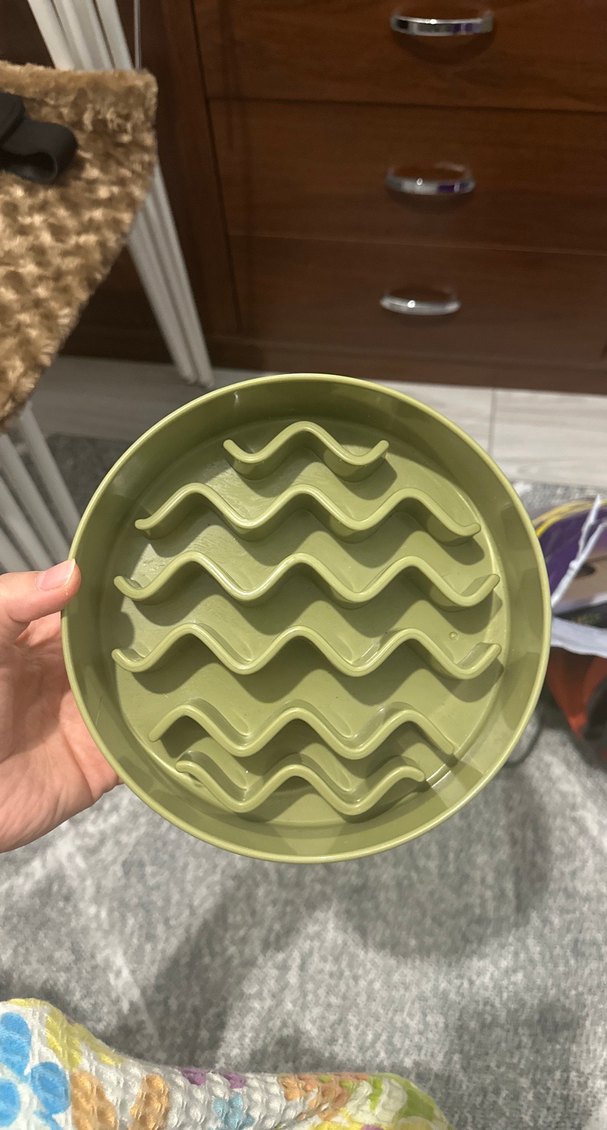 Kedi veya köpeklerin yavaş yiyebilmesi için özel üretilmiş mama kabı. Kedilerim için kullandım ama pek sevemediler. Kediler için fazla derin olduğunu düşünüyorum. Köpekler için daha uygun olabilir. Altında çevresini saran beyaz şey kaydırmaz plastik. Çapı: 19 cm Derinliği: 5 cm