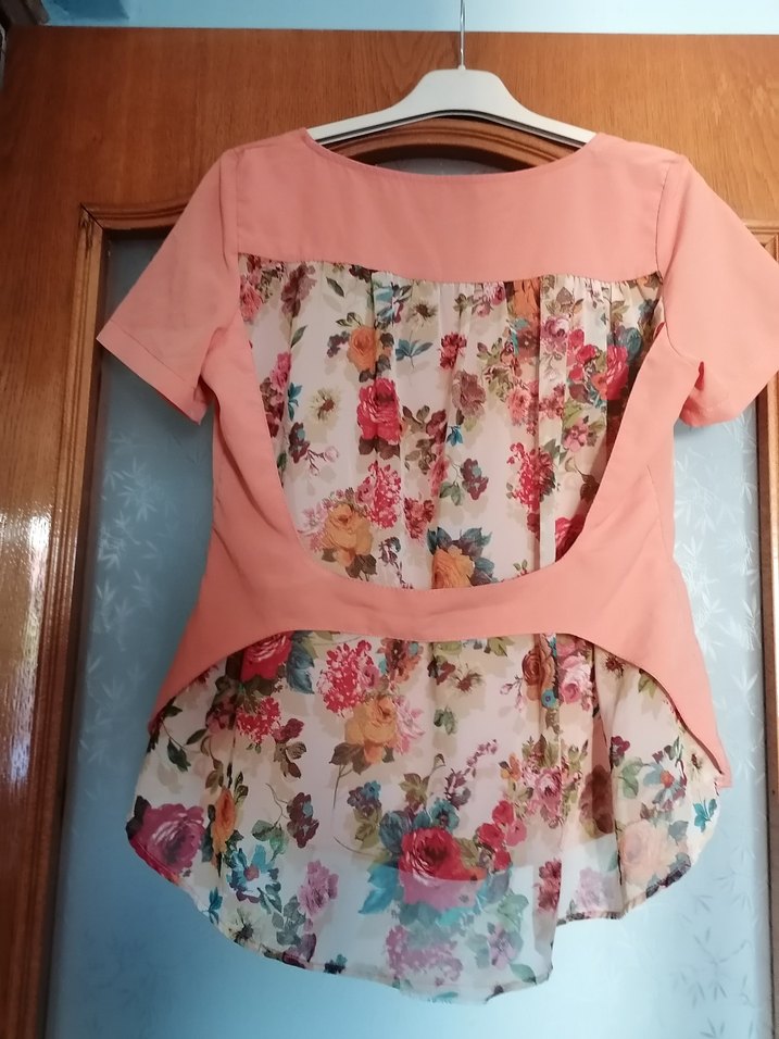 Kısa kollu, yuvarlak yakalı ve bol kesim kadın bluzudur. Pembe düz kumaş ve çiçekli sırt detayıyla vintage bohem tarzı sunar.