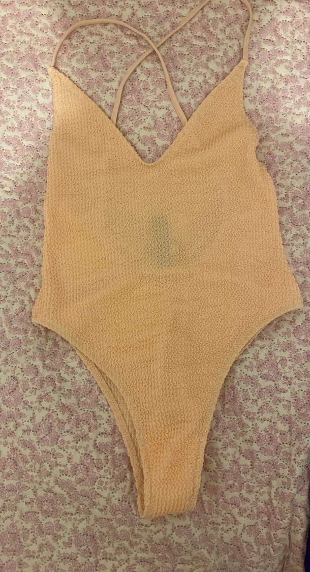 Yavru ağzı renkte, büzgülü dokulu mayo. Koyu ten renginde mükemmel duruyor