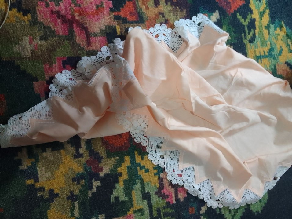 yavru ağzı pastel renkte masa örtüsü, geleneksel dantel nakışıyla süslenmiş, yumuşak ve zarif bir görünüm sunar. el örgüsü kenarları