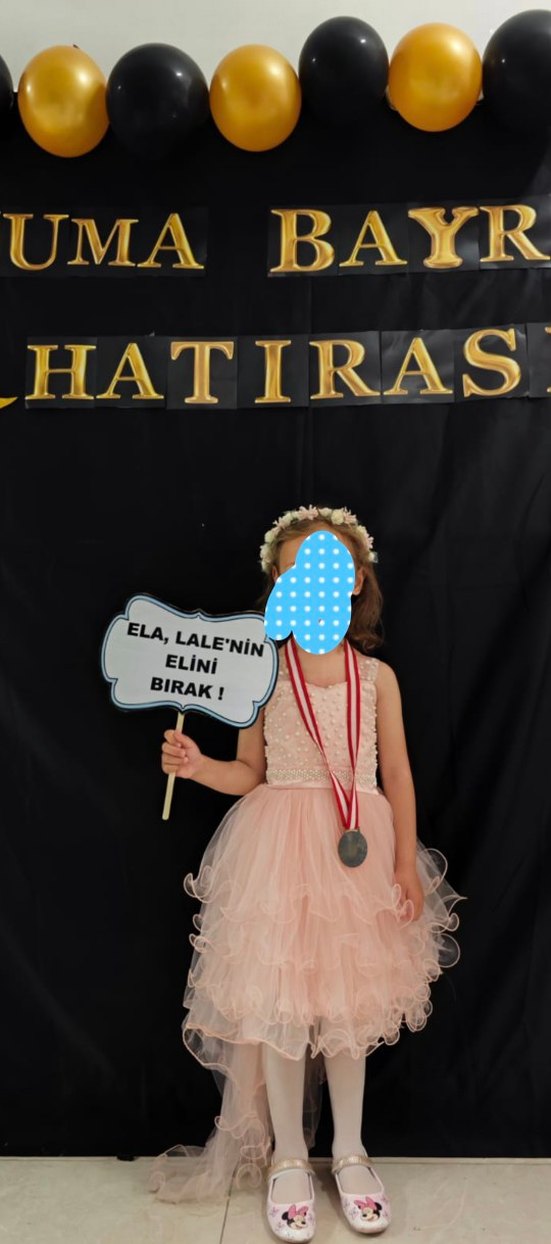 Dantel detaylı, notched lapel yakalı ve askılı kollu, baskılı arkası uzun kuyruklu yavruağzı , vücuda oturan kız çocuk abiye elbise. deforme eskime yoktur..